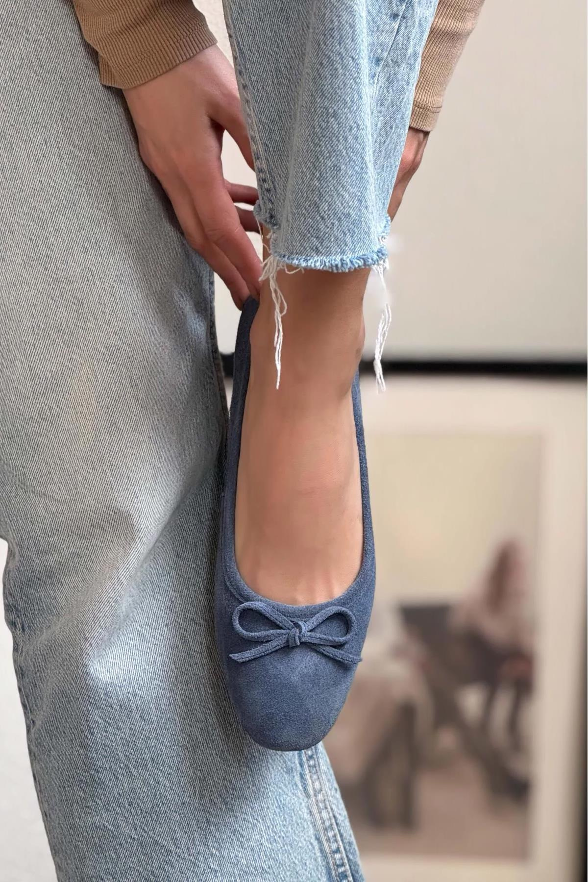 EFFİE FİYONKLU HAKİKİ DERİ SÜET KADIN BABET MAVİ