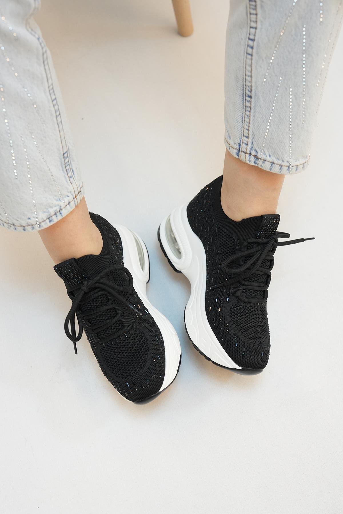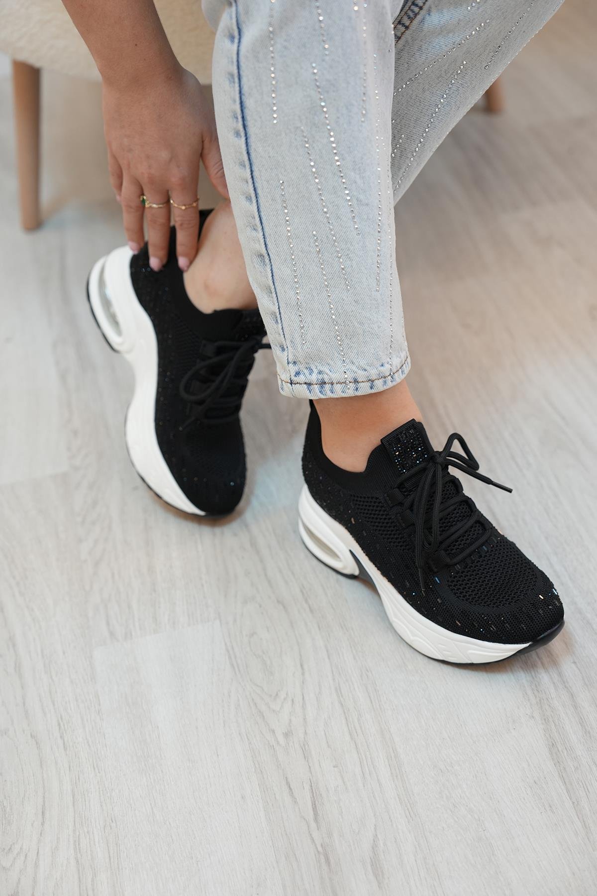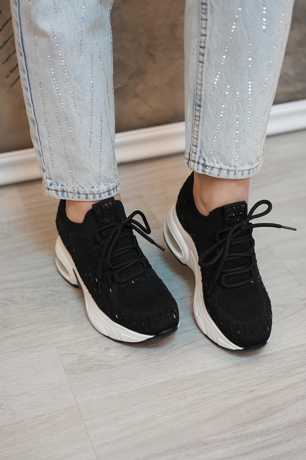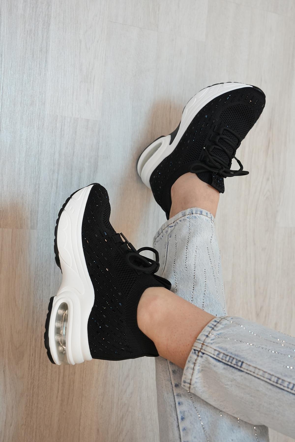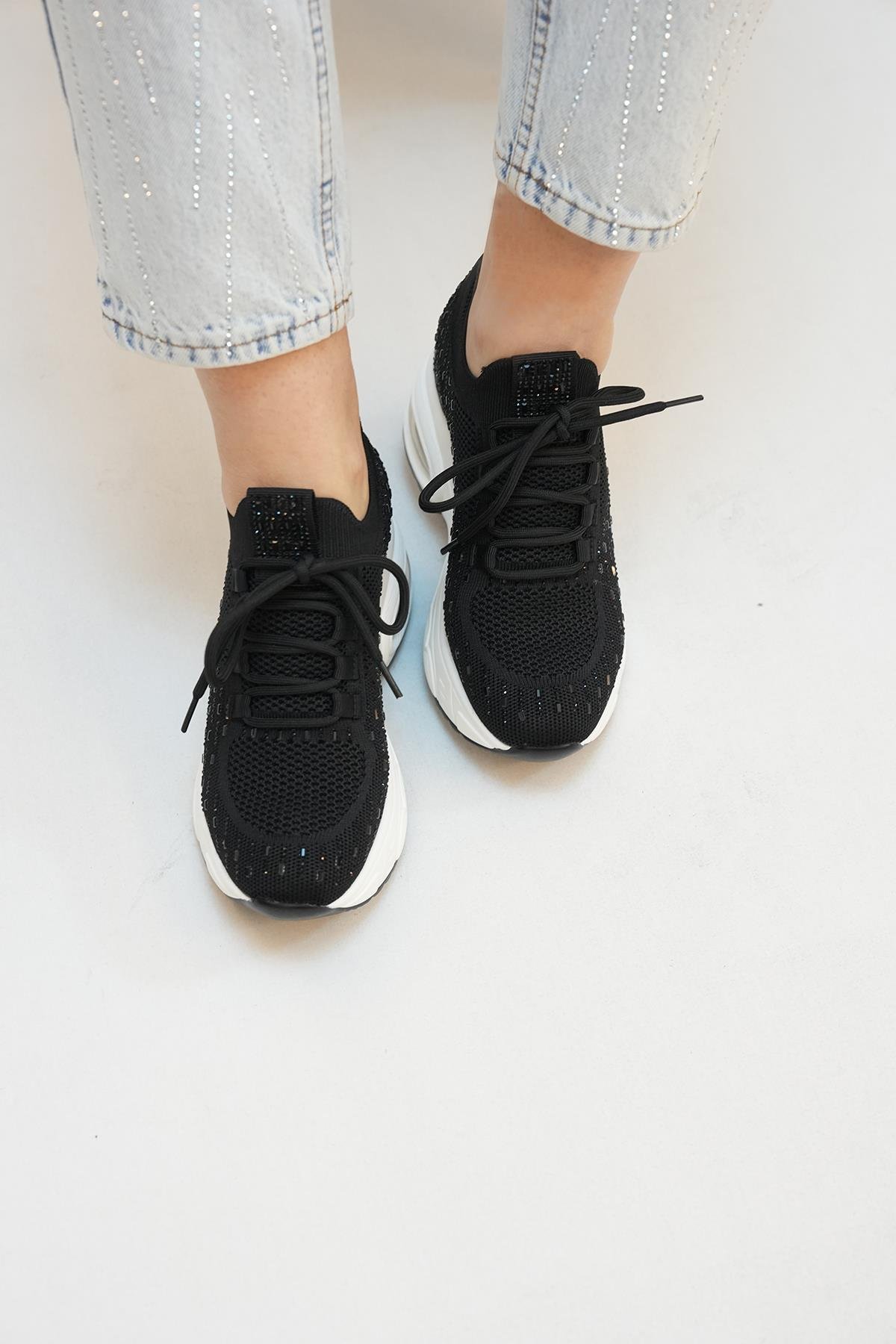 HİLDA GUJA İTHAL ÖZEL SERİ İÇTEN GİZLİ DOLGU TAŞ DETAYLI TRİKO KADIN SPOR AYAKKABI SİYAH