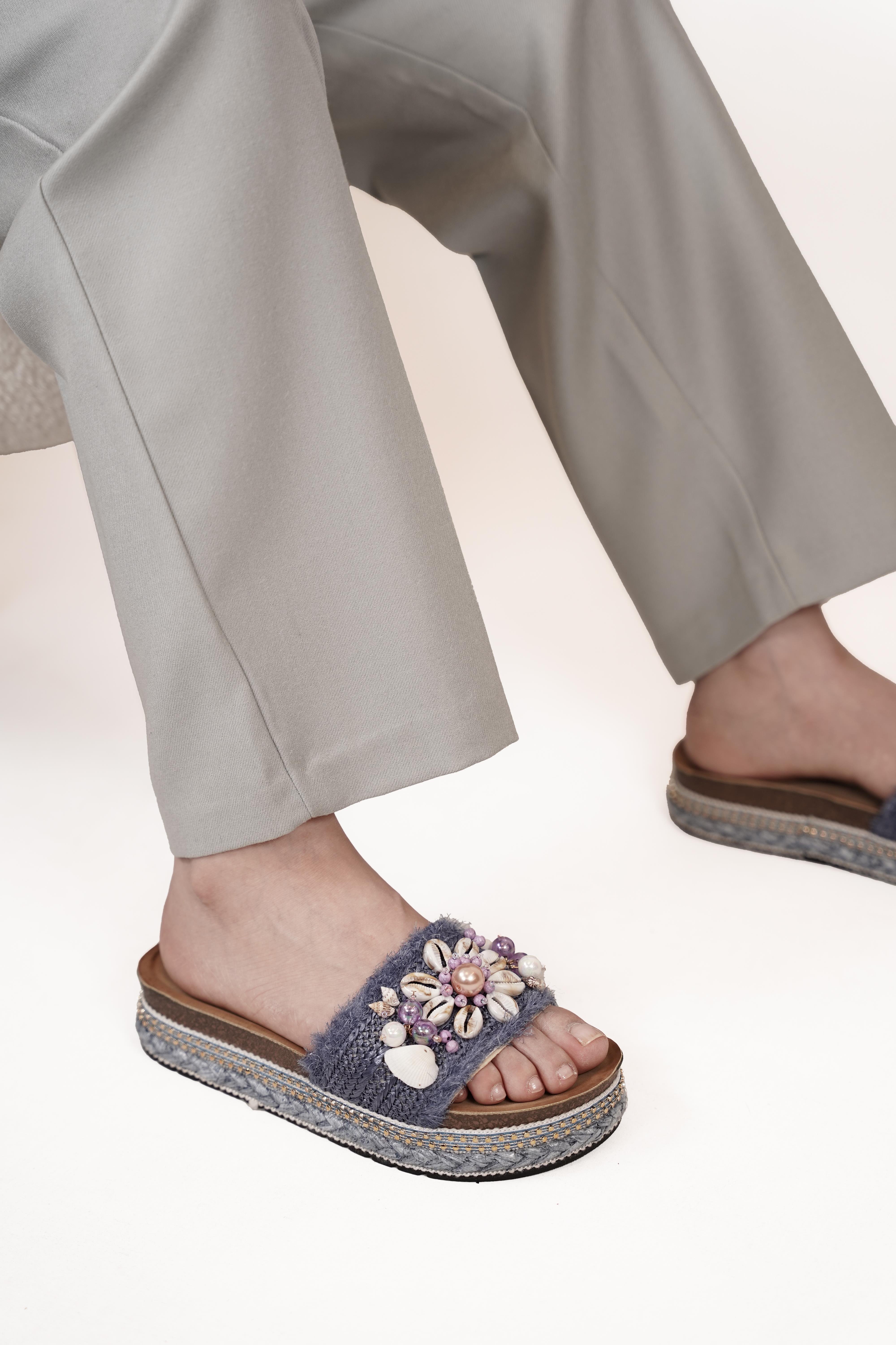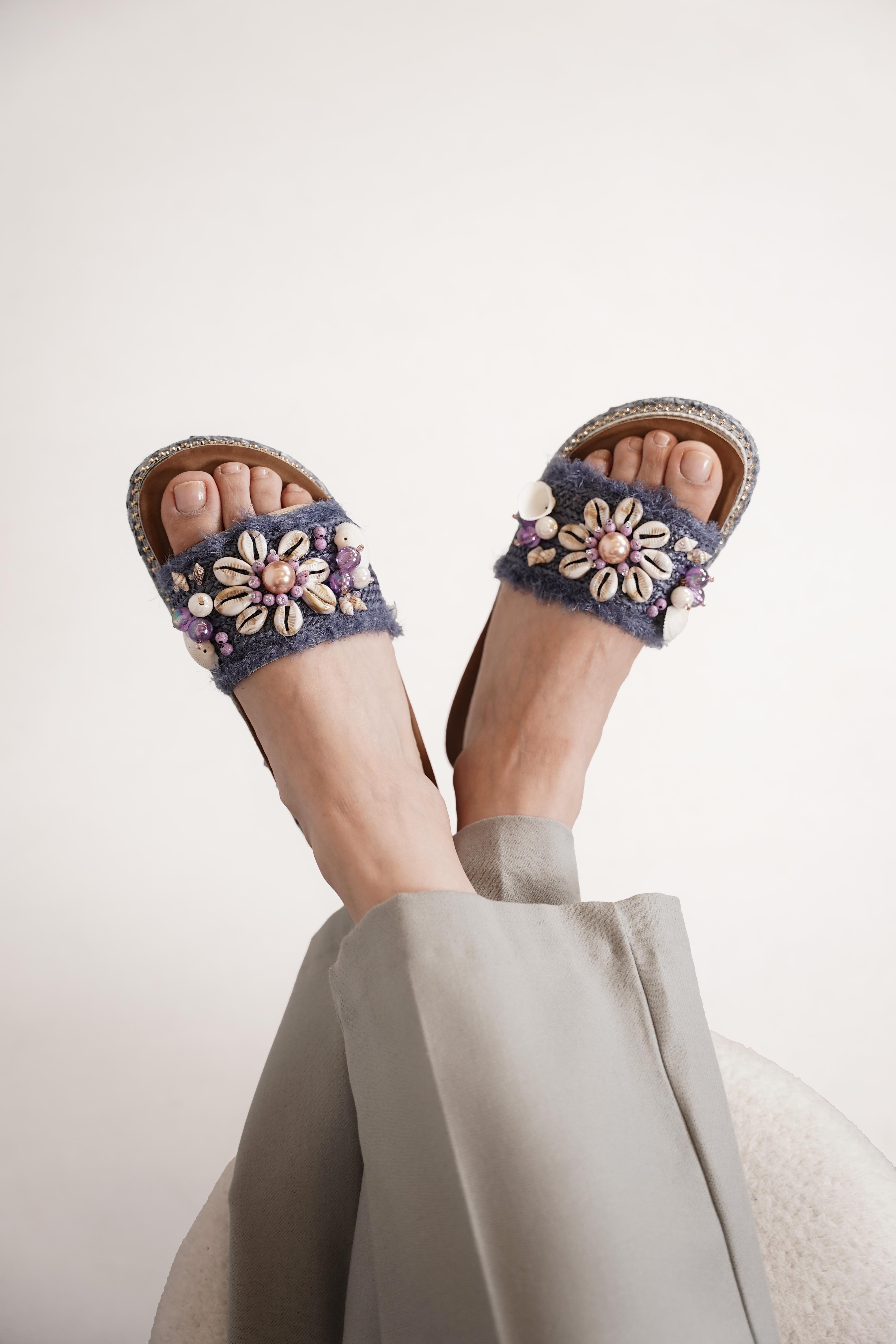 İMELDA GUJA İTHAL ÖZEL SERİ DENİZ KABUĞU TAŞ DETAYLI COMFORT KADIN TERLİK MAVİ