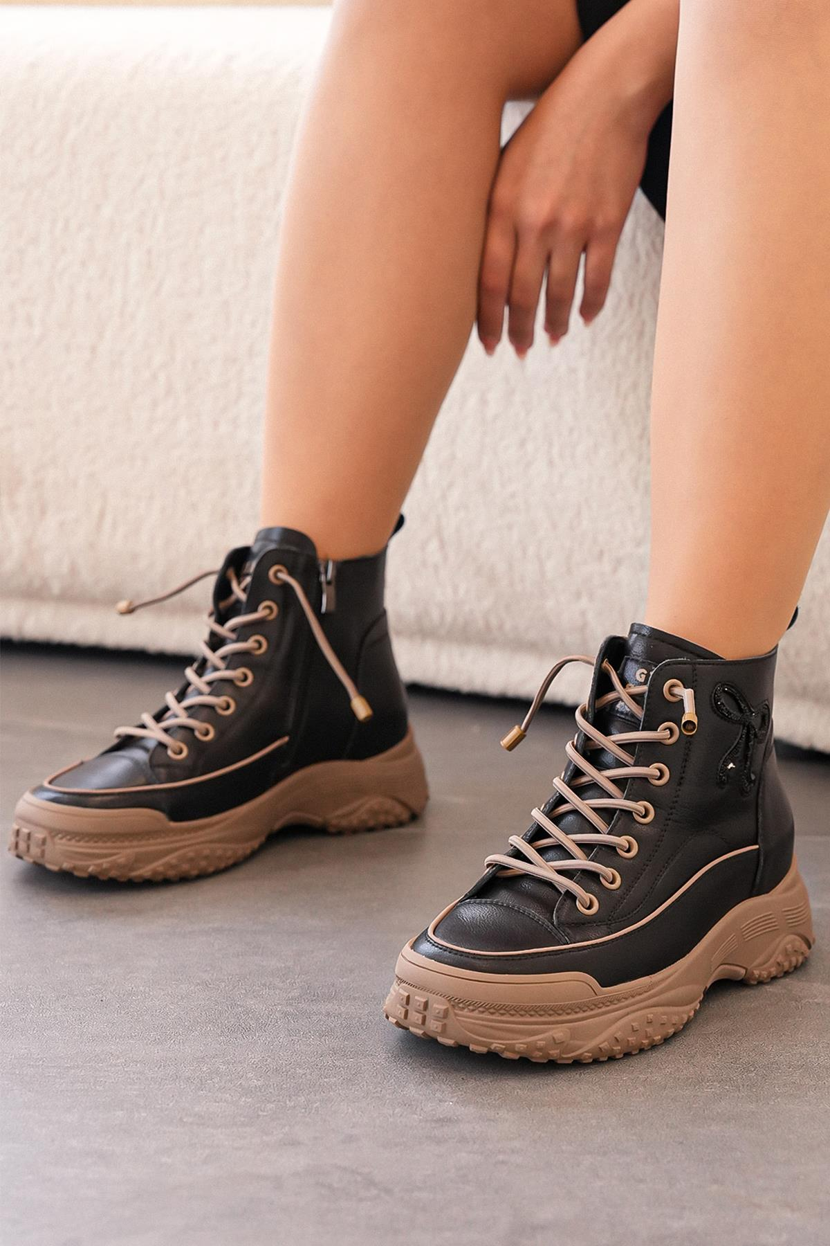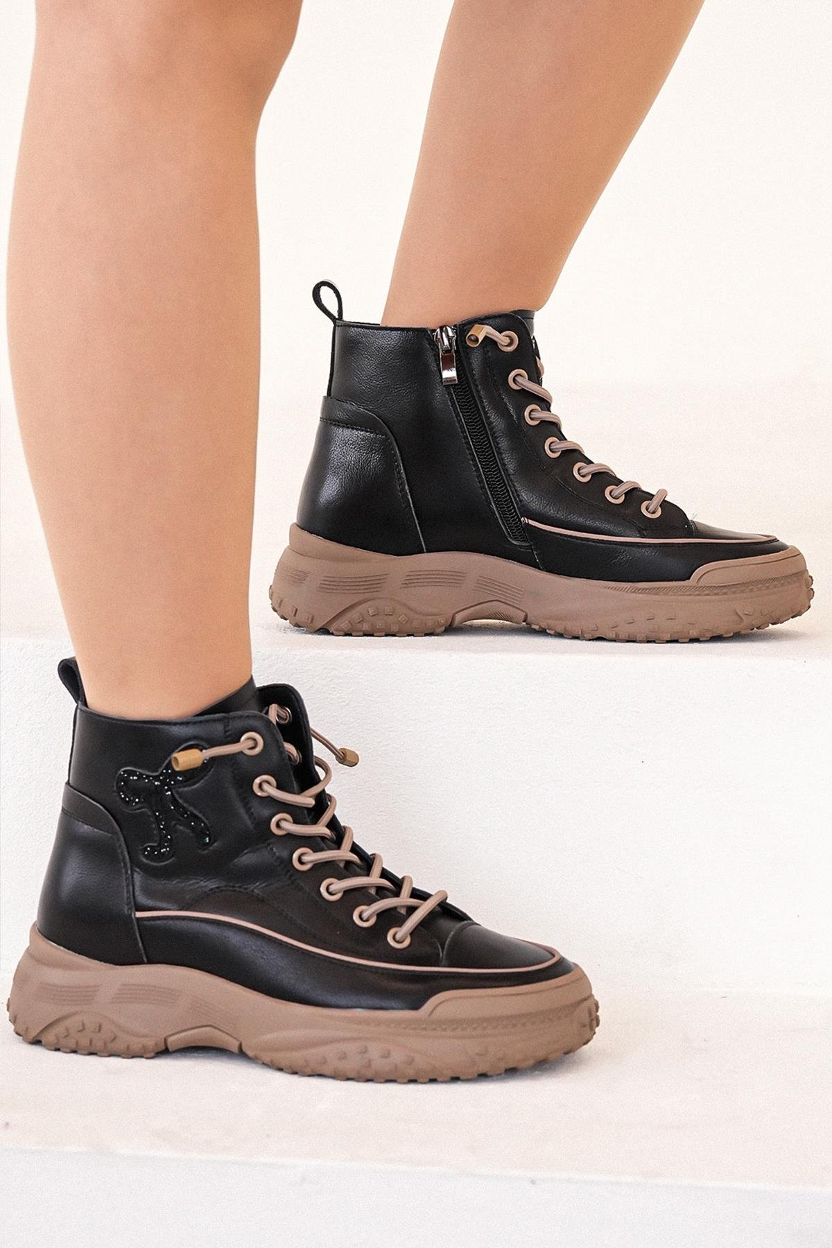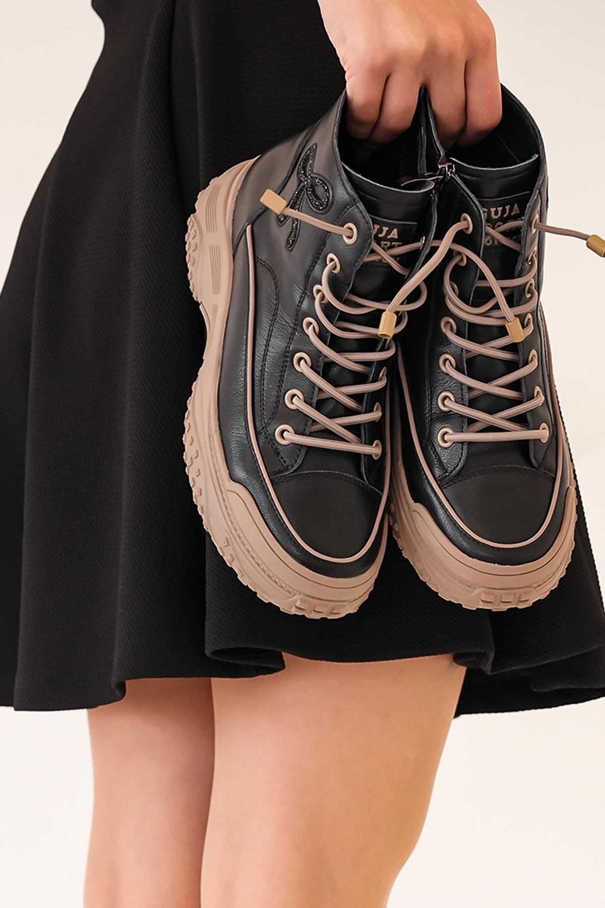 JERRY GUJA İTHAL ÖZEL SERİ YAN TAŞ DETAYLI HAKİKİ DERİ KADIN SPOR BOT KÖMÜR